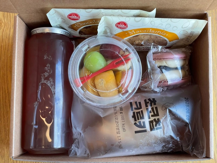간식박스(캔시머음료 + 쿠키2종 + 컵과일 + 마카롱 + 크루키) 18,800원
