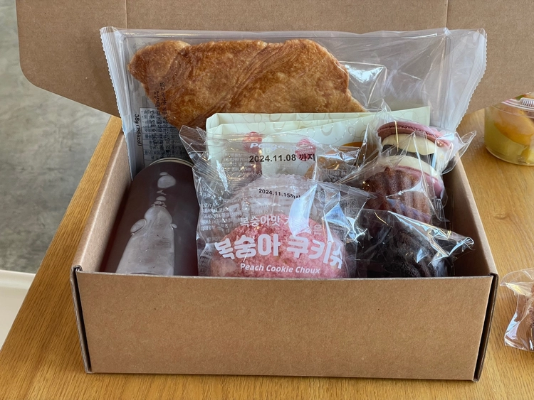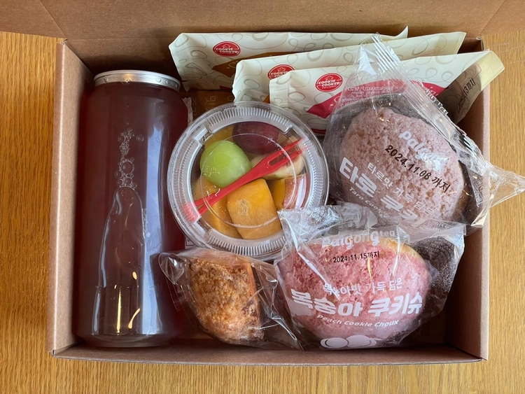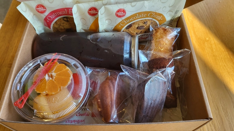 간식박스(쿠키 3종 + 캔시머 음료 + 컵과일 + 마들렌2종 + 휘낭시에 2종) 22,400원